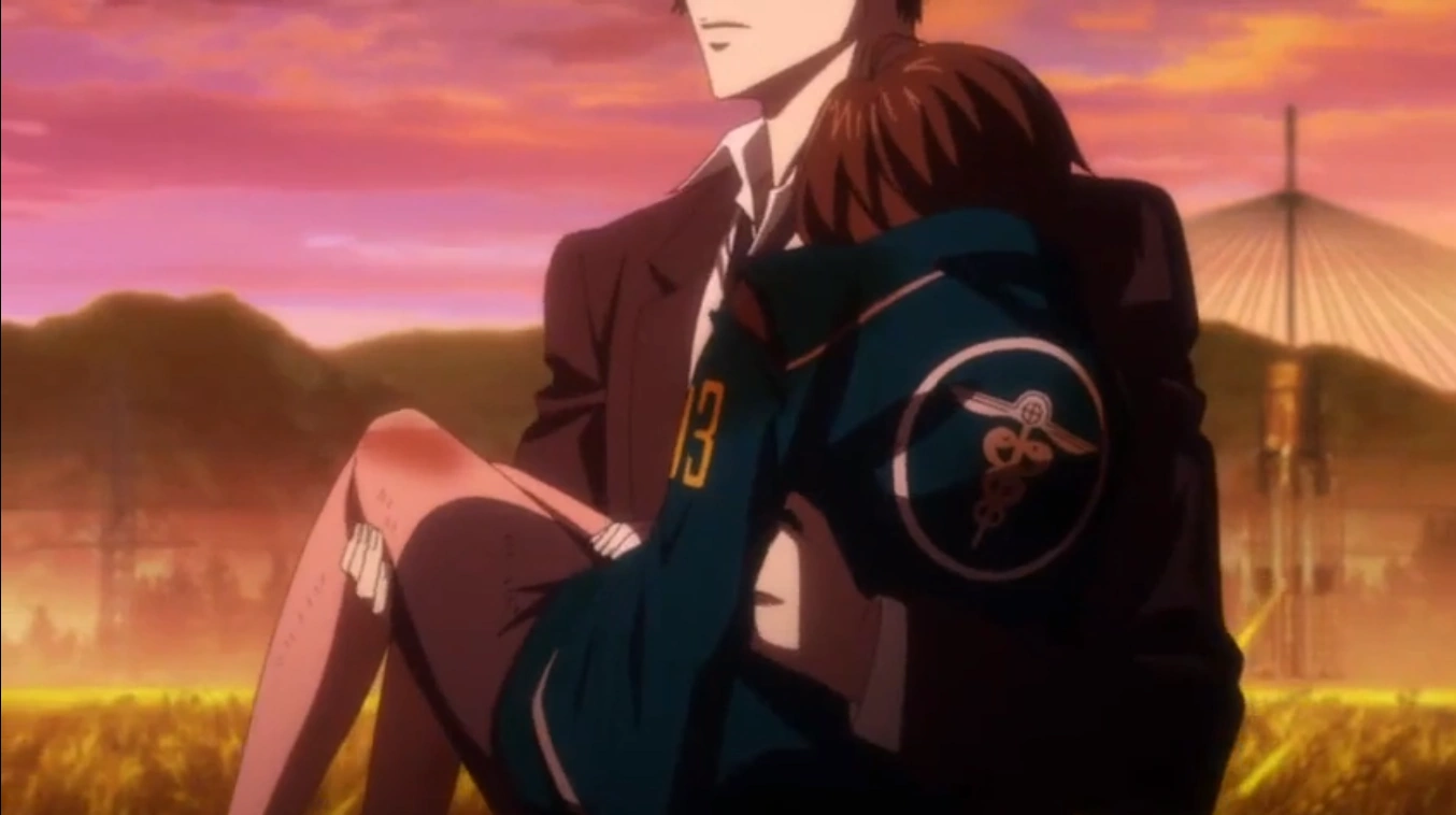 Shinya niesie ranną Akane w Psycho-Pass Odcinek 22 „Idealny świat".