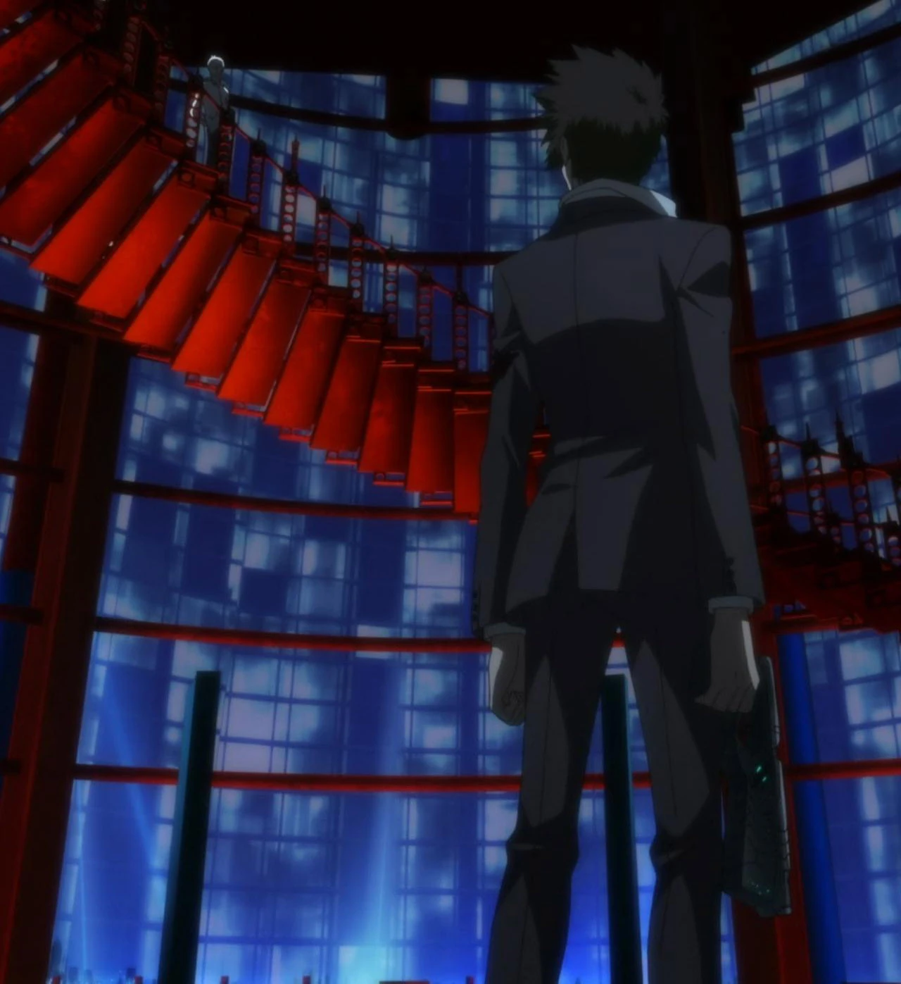 Within the upper stories of a dark tower, Kogami is seen battling a helmeted opponent. He shoots his foe who crashes through the window, exploding in mid-air as he falls. Shogo Makishima, who has been observing, congratulates Kogami on his stamina despite being injured. The voice of Tsunemori is heard as voice-over revealing that these two men are linked by fate, though this is the first time they have met in person. The image dollies back to reveal the NONA Tower as the series title emerges.