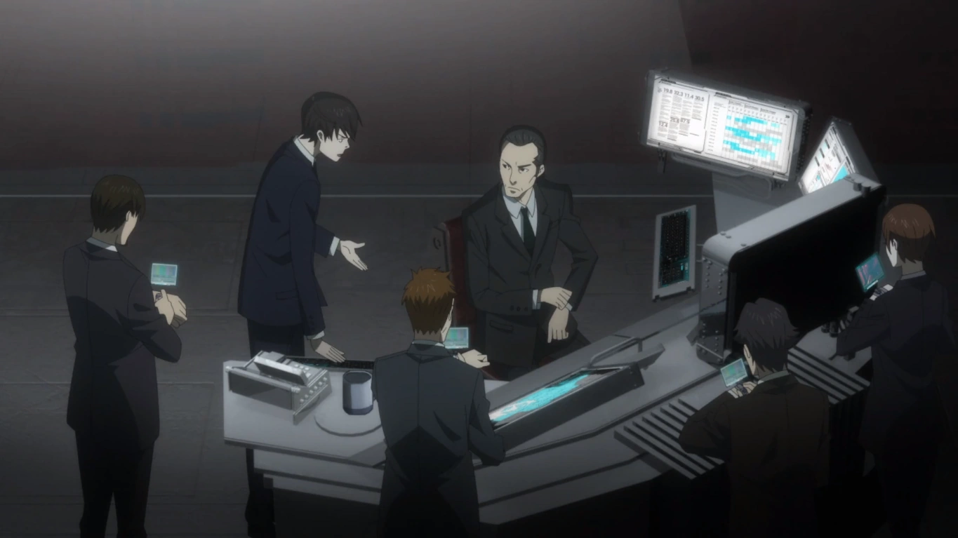 This is the personnel of the Ministry of Welfare Public Safety Bureau's Criminal Investigation Department, Division 02. This division is rarely seen and plays a secondary role. It shows favor towards Nobuchika Ginoza, as seen when he attempts to get help from them while working the Shogo Makishima case.[1]
