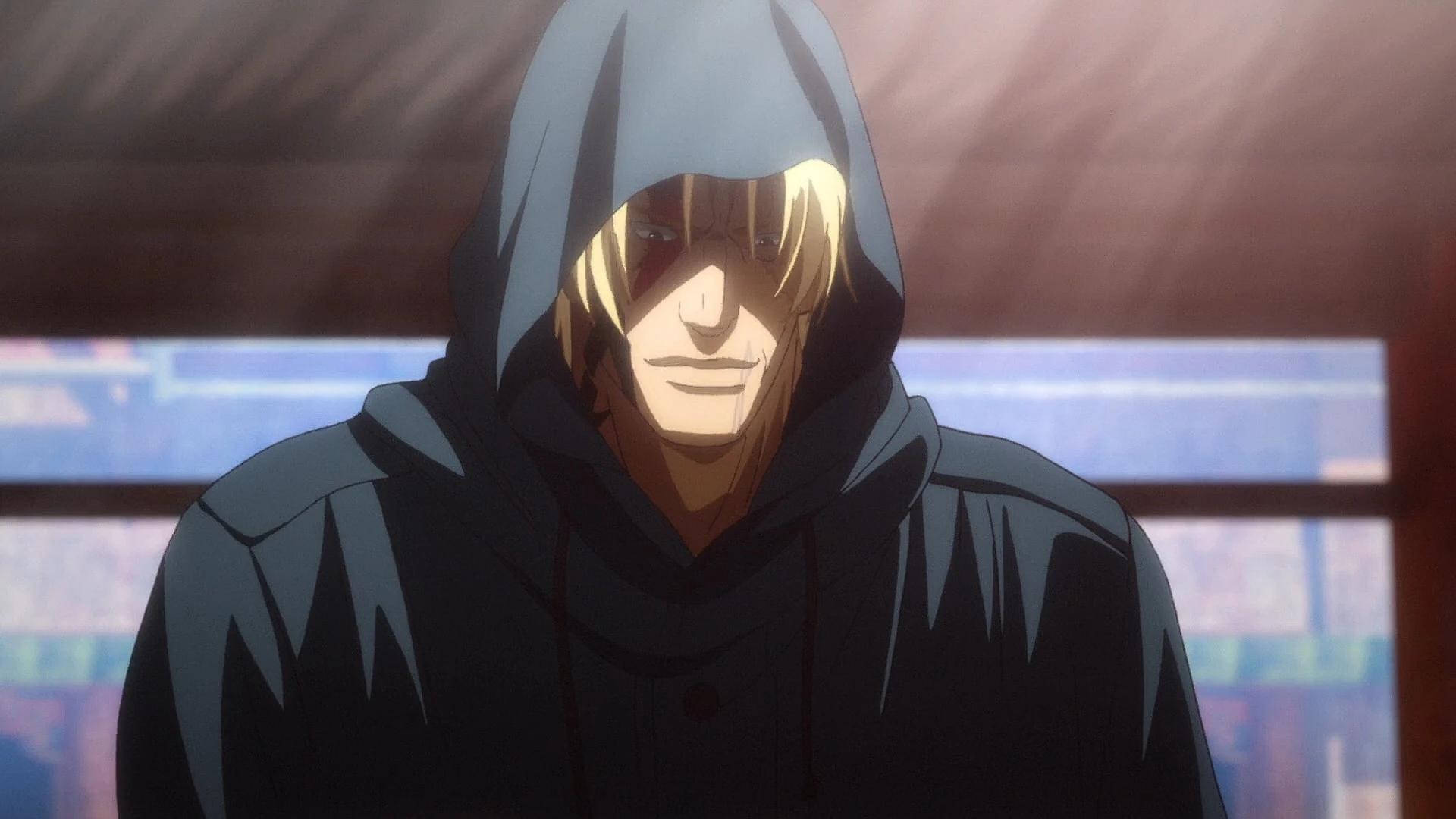 Belmondo is a male with a muscular build who appears to be in his 30's. He has long blond hair and eyes of an unknown color, as he is typically seen wearing a hood drawn over his head to conceal his face. He has a tattoo below his right eye that extends down his neck.[1]