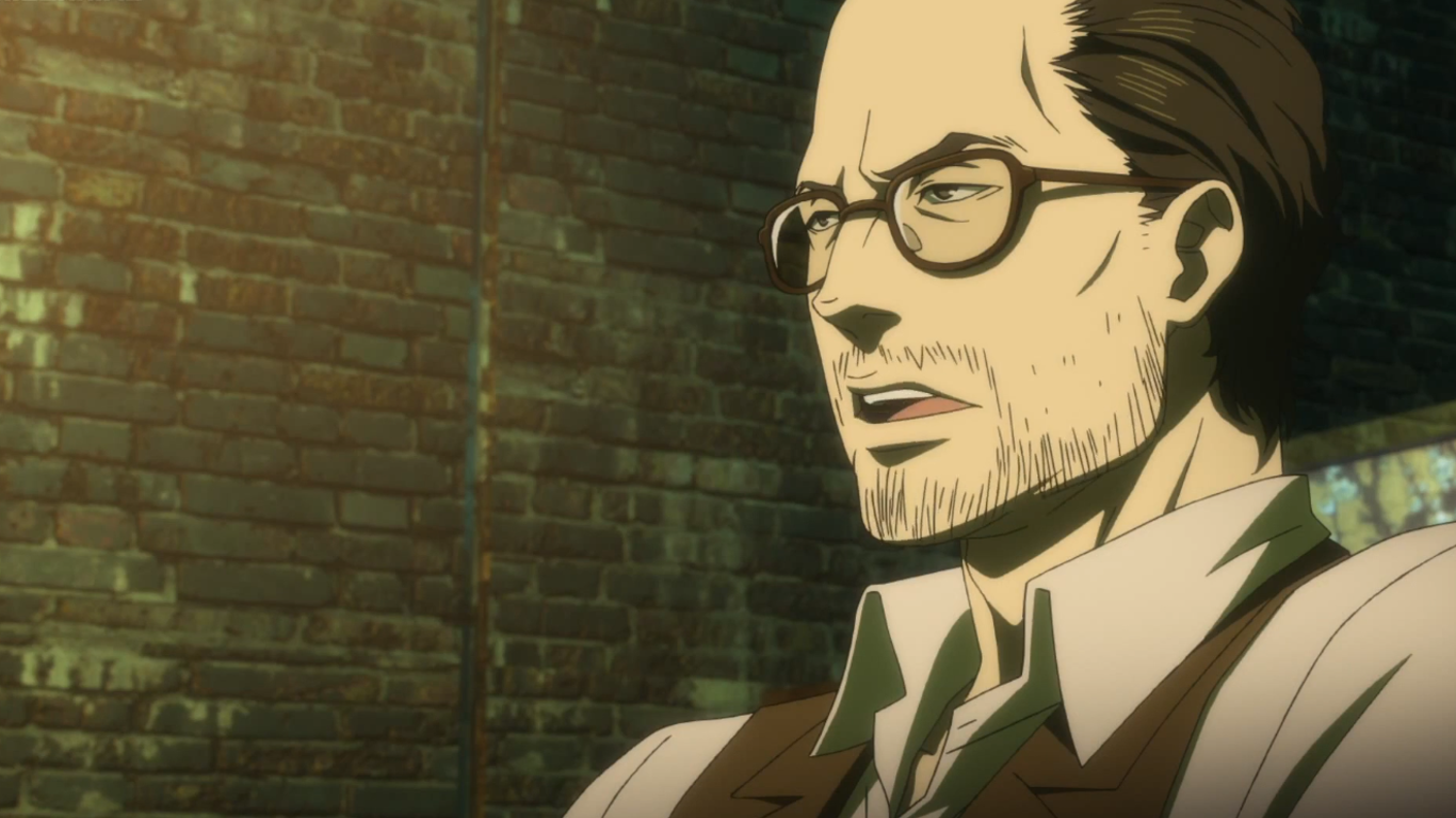 Saiga is a male in his 50's of average height and build with brown eyes and short brown hair swept back. He is typically seen wearing a green sweater and woolen muffler.[1] When he becomes an Analyst, he begins wearing a white lab coat, under which he wears a shirt and pullover.[2] He wears corrective lenses. In Psycho-Pass: The Movie, he is wearing a brown vest and shoes, a white shirt and black pants. In Psycho-Pass: Providence, he is seen with some gray hair.